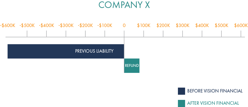 One of our clients had recently incurred a tax liability of approximately $600k. By implementing some of our legal, specialized strategies, Vision Financial was able to help them turn their $600k tax liability into a $83k refund.